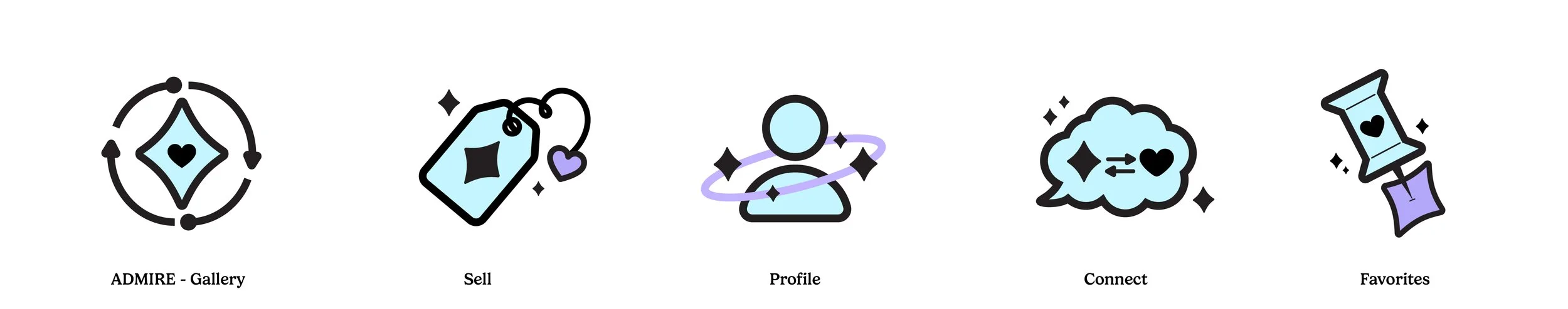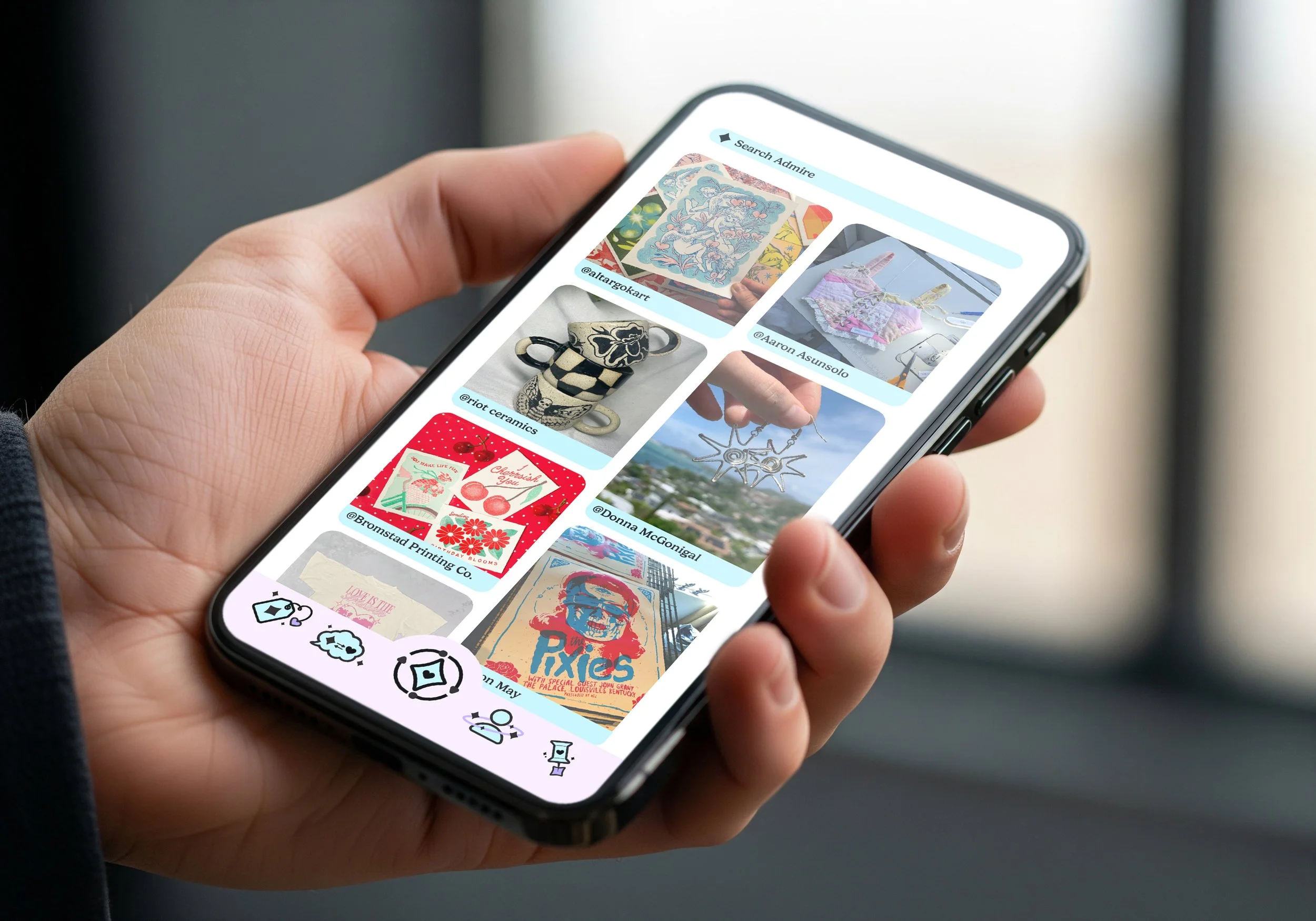 In order to work with my icon skills, I created an app that works as Etsy x Pinterest, an app where art and crafts are displayed in an aesthetic feed, but there are direct links to buy everything you see. My aim for the icons was to feel recognizable but also connect to the app’s theme.