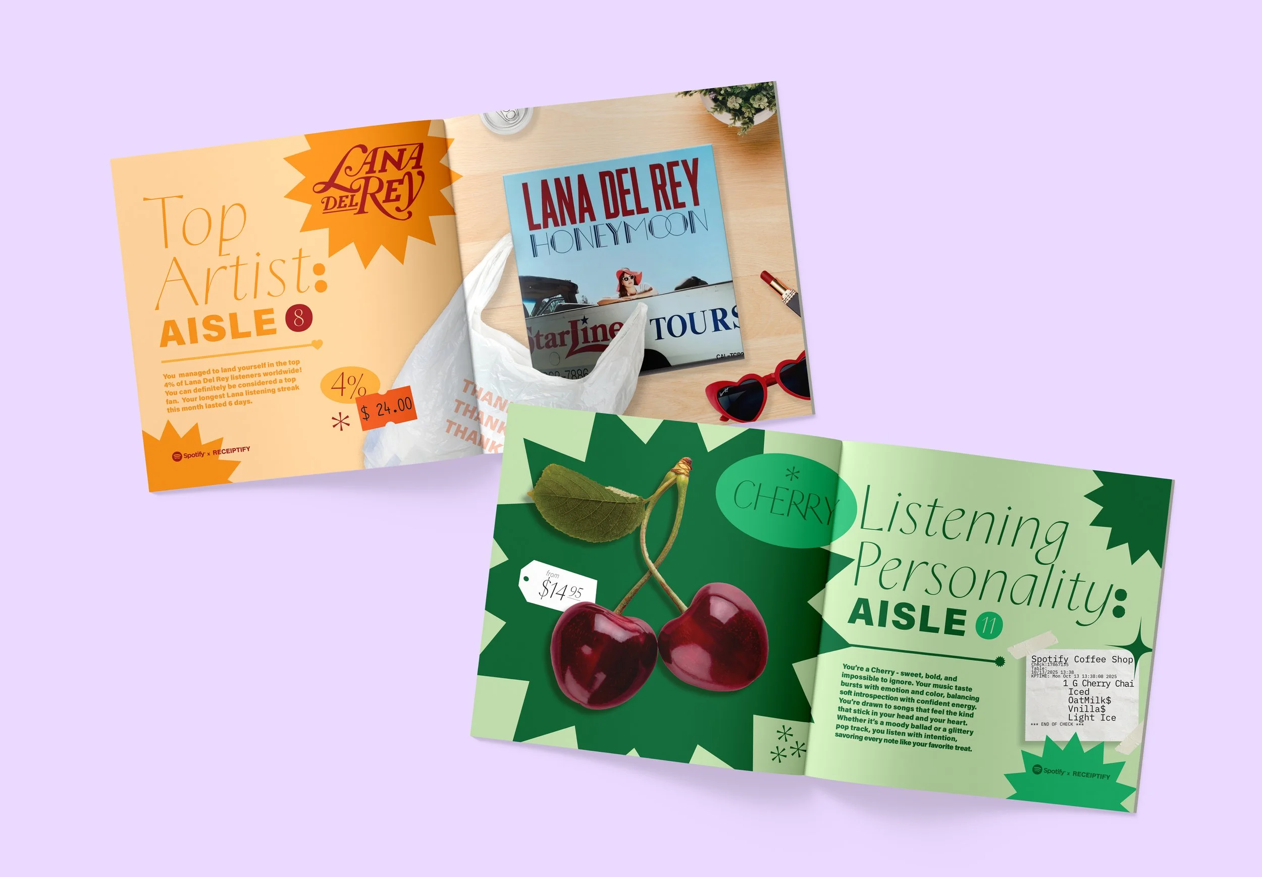 For this project, I created a mock collaboration between Spotify (The most popular digital music service) and RECEIPTIFY, which is a site that allows Spotify listeners to view their monthly listening stats in the form of a digital receipt. I created an entire collaboration between the two, which is a monthly subscription box. I was inspired by the receipt concept to make the entire design of this box set grocery store themed. Coupons, lists, stickers, produce, shopping carts, foods, etc. Spotify’s yearly stats that are sent out are called “WRAPPED”, so I decided to name this collab, “UNWRAPPED”